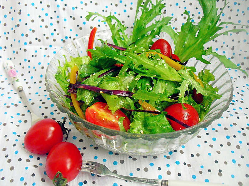 1:将青菜用盐水浸泡洗净。黄瓜、紫甘蓝、青椒、洋葱切丝,西红柿切小块,苦苣切段放入搅拌碗中。