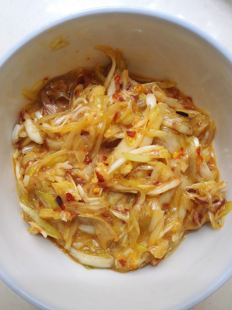 6:将辣椒油、蒜末和所有配料放入大头菜的盆中