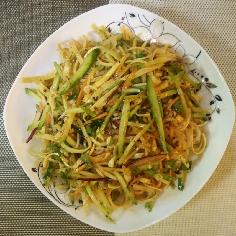 黄瓜适量;薄豆腐皮1张;粉丝适量;胡萝卜半个;圆葱一点;