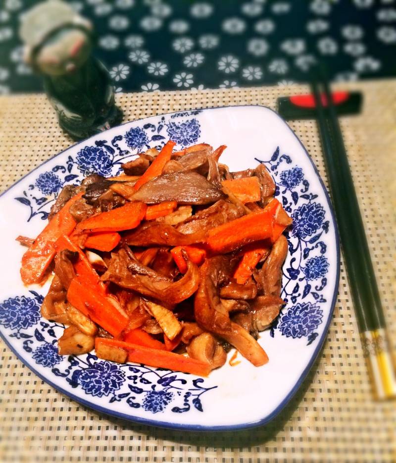 3:坐锅倒入食用油,待油温四成热下入葱花、瘦肉丝煸炒片刻即下入胡萝卜片、平菇,黄瓜片,淋入耗油、食盐、鸡精继续翻炒几下即可出锅装盘。