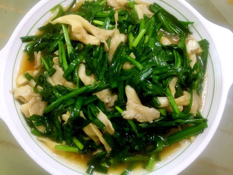 4:待平菇翻炒均匀,加入韭菜,加入盐,不断翻炒片刻