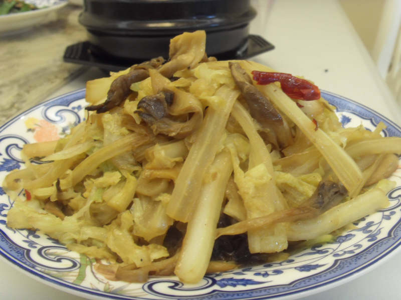 5:再倒入白菜丝翻炒至白菜瘫软时加盐继续翻炒至熟;