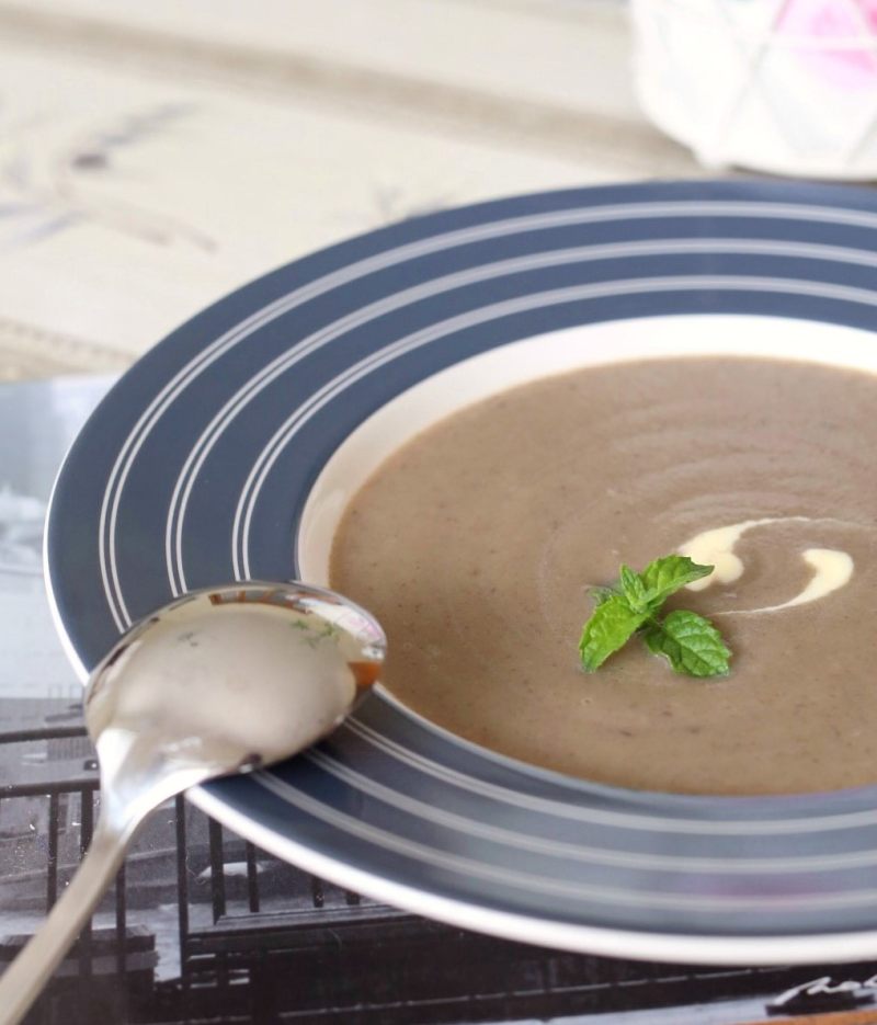 4:5分钟后熄火,用手持搅拌器把煮软的平菇和洋葱绞碎,绞茸,倒入面粉水,并不停搅拌。中小火把汤煮开,直到粘稠状,全程不要停止搅拌