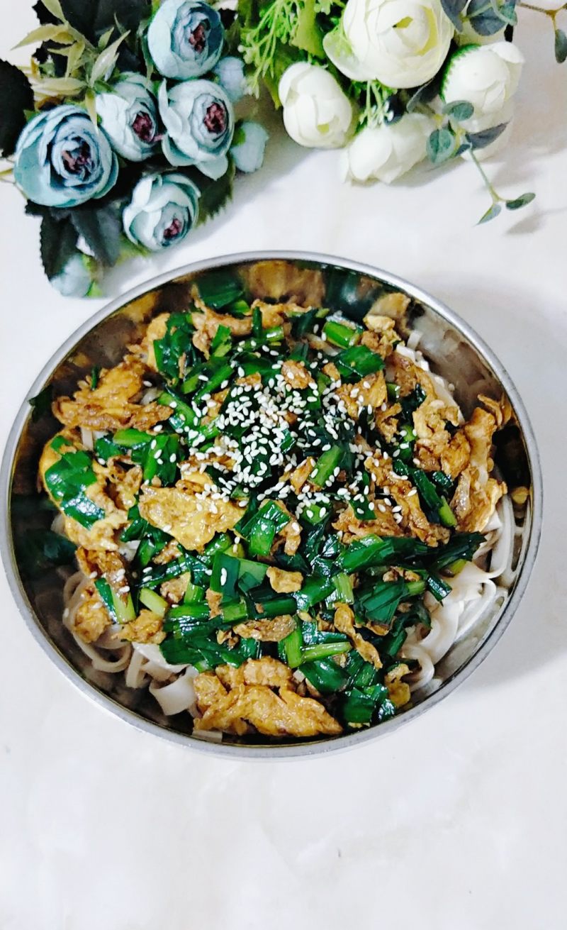 7:浇上韭菜鸡蛋,撒上点熟芝麻点缀一下。就OK啦!