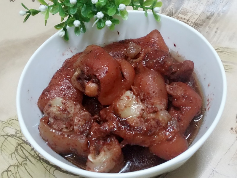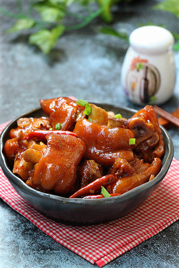 6:待猪蹄煮软糯后,放入适量的盐调味,然后开大火收汁,让汤汁红亮粘稠后就可以关火,起锅前放入少许的味精,味道更鲜美。