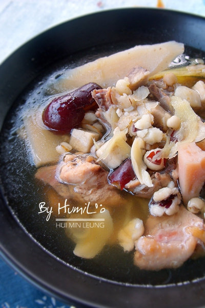 姜片2大片;薏仁1小撮;茨实1小撮;土茯苓1小撮;百合1小撮;山药1小撮;红枣5颗;