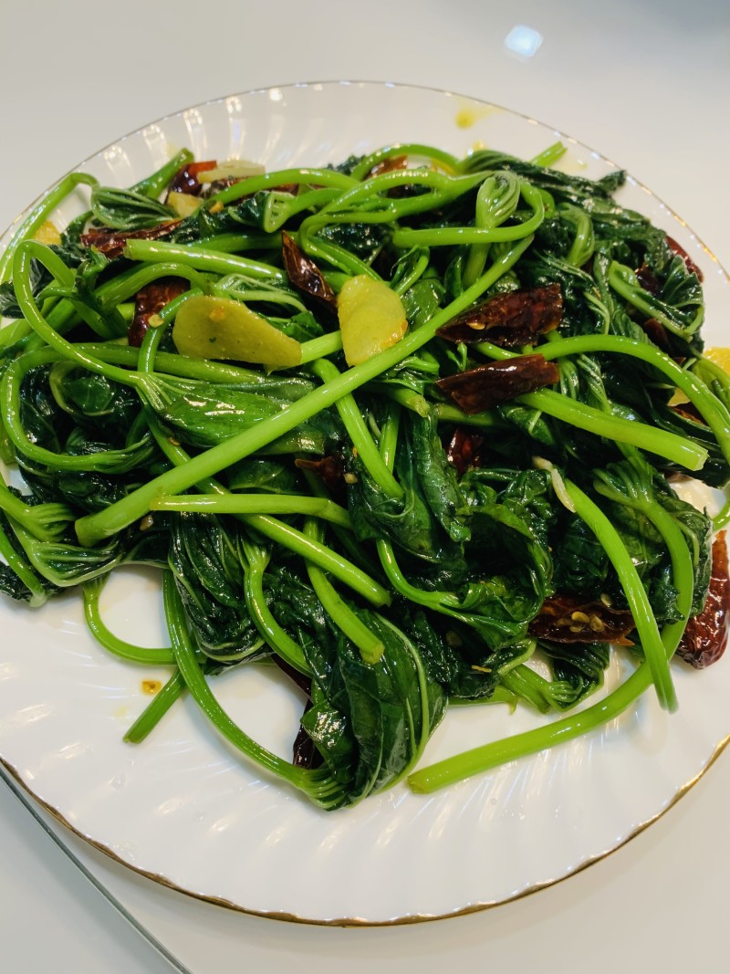 4:蒜米爆香后,开大火,姜洗干净的红薯叶倒入翻炒