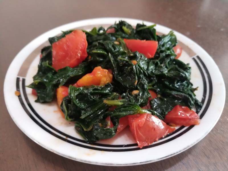 6:锅烧热放油,倒入红薯叶和西红柿翻炒一下,加盐调味即可。