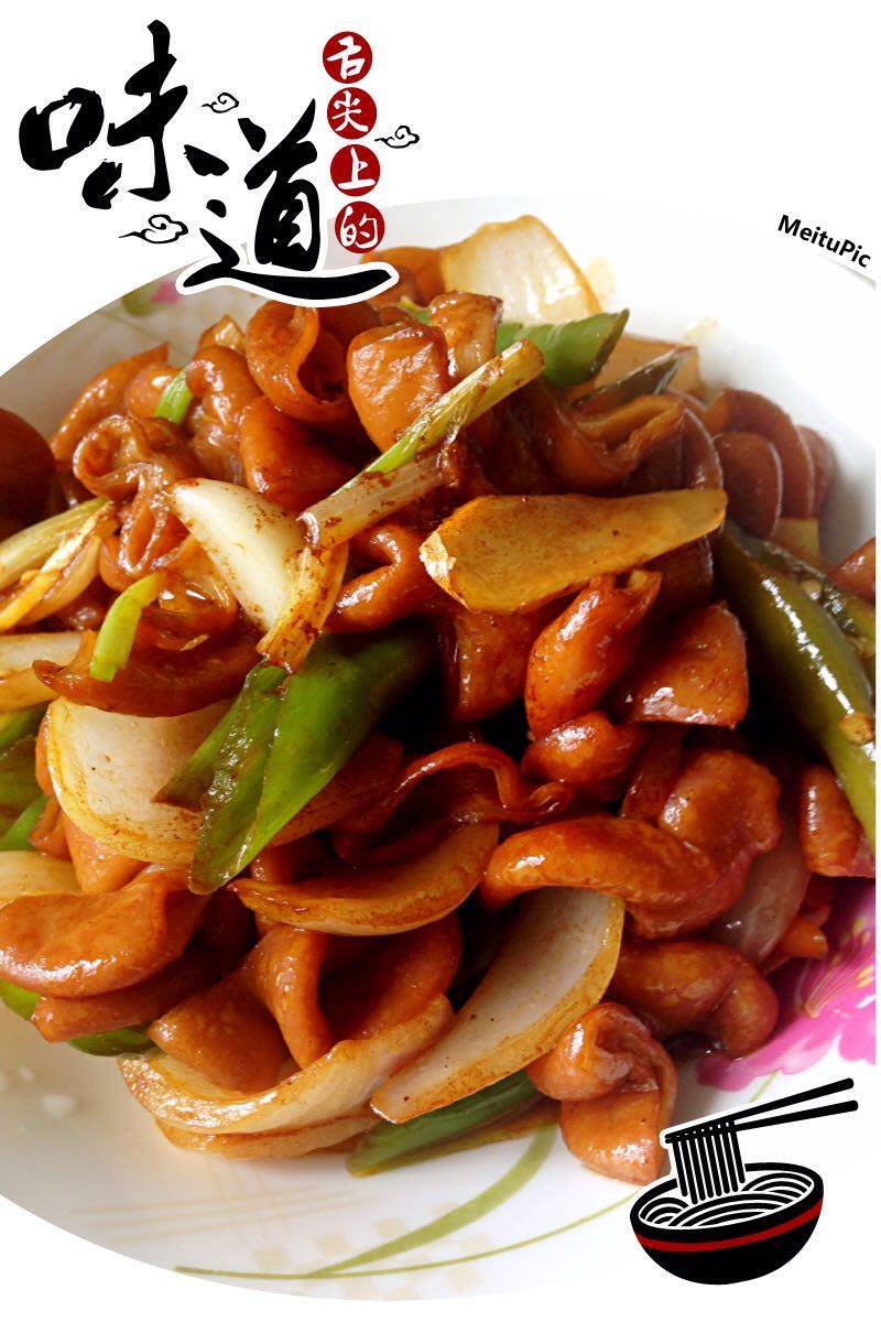 4:锅里倒入油,杭椒,洋葱,姜蒜下锅炒香,倒入肥肠,放点料酒,酱油,醋翻炒即可。
