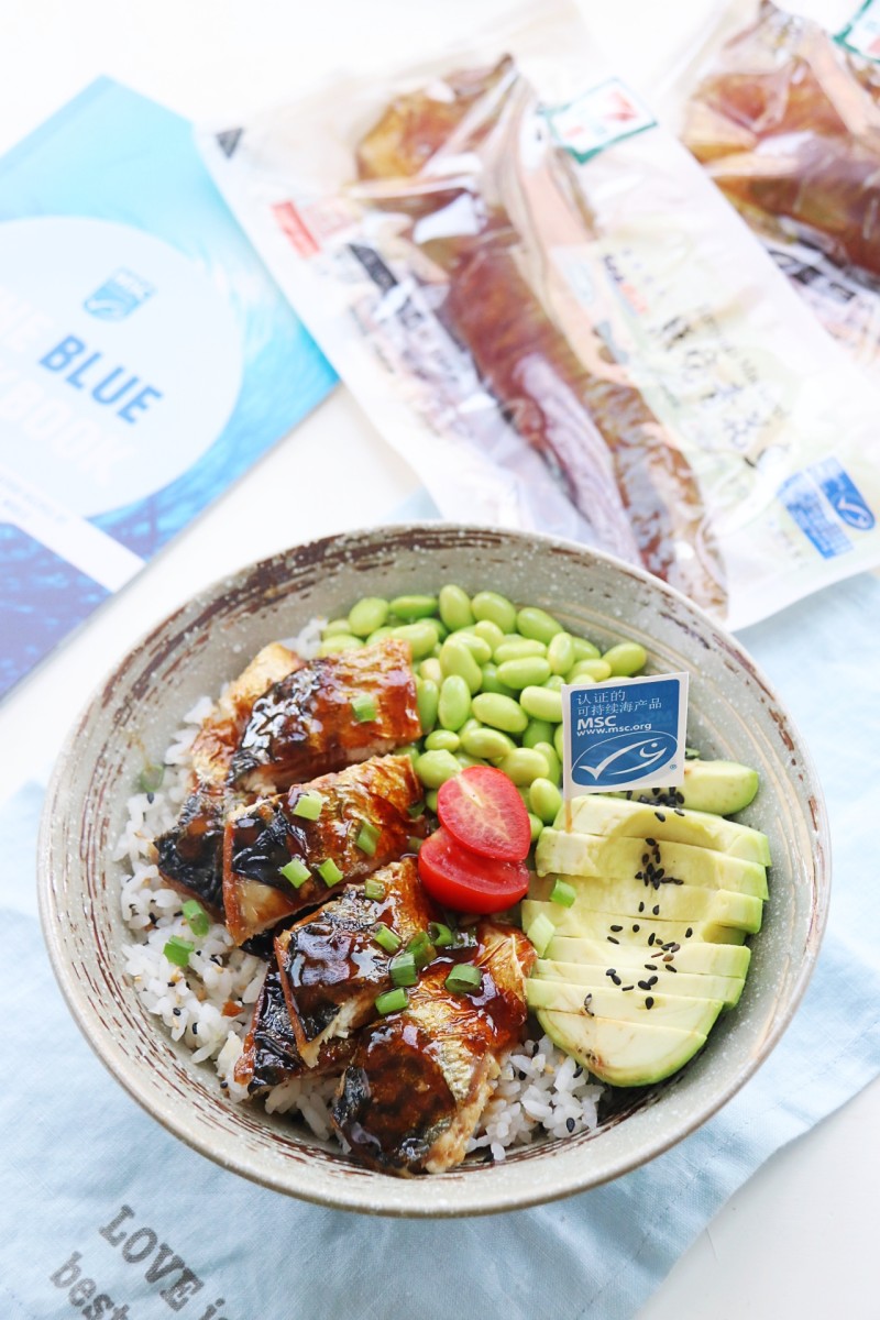 4:将烫熟的毛豆粒、切片的牛油果,以及照烧青花鱼铺在米饭上即可。