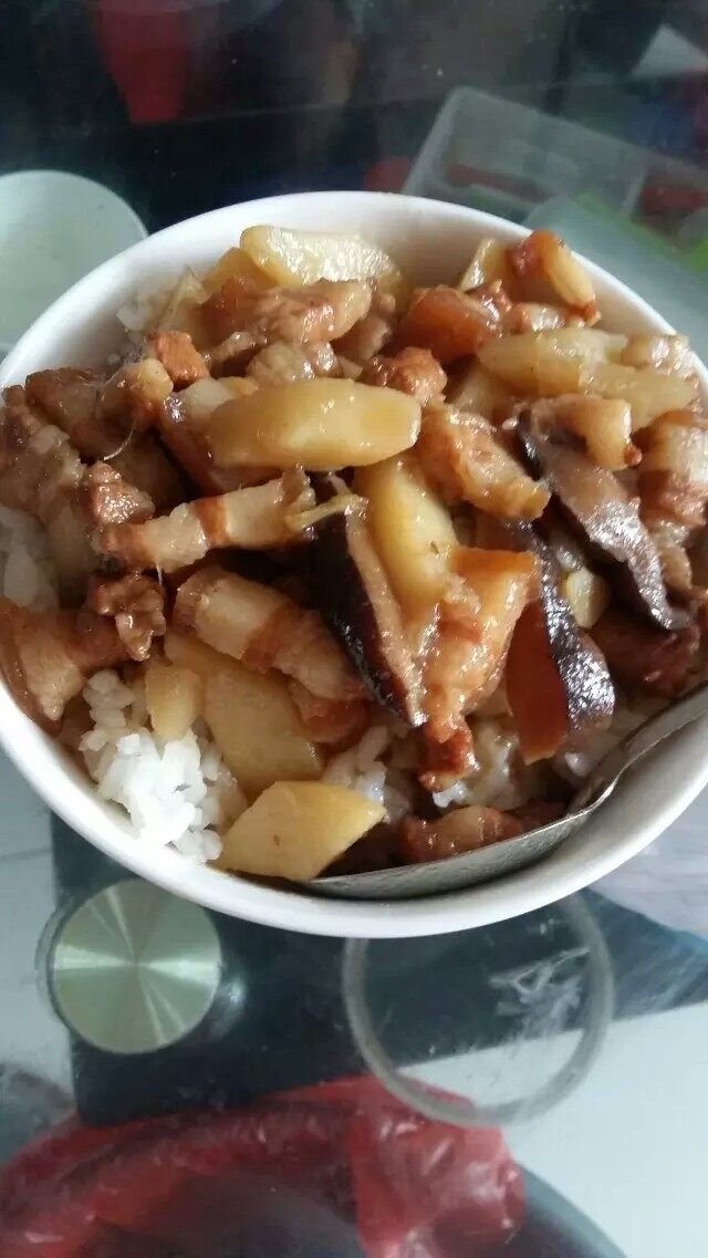 12:把做好的五花肉烧土豆,盖在米饭上(多放汁)