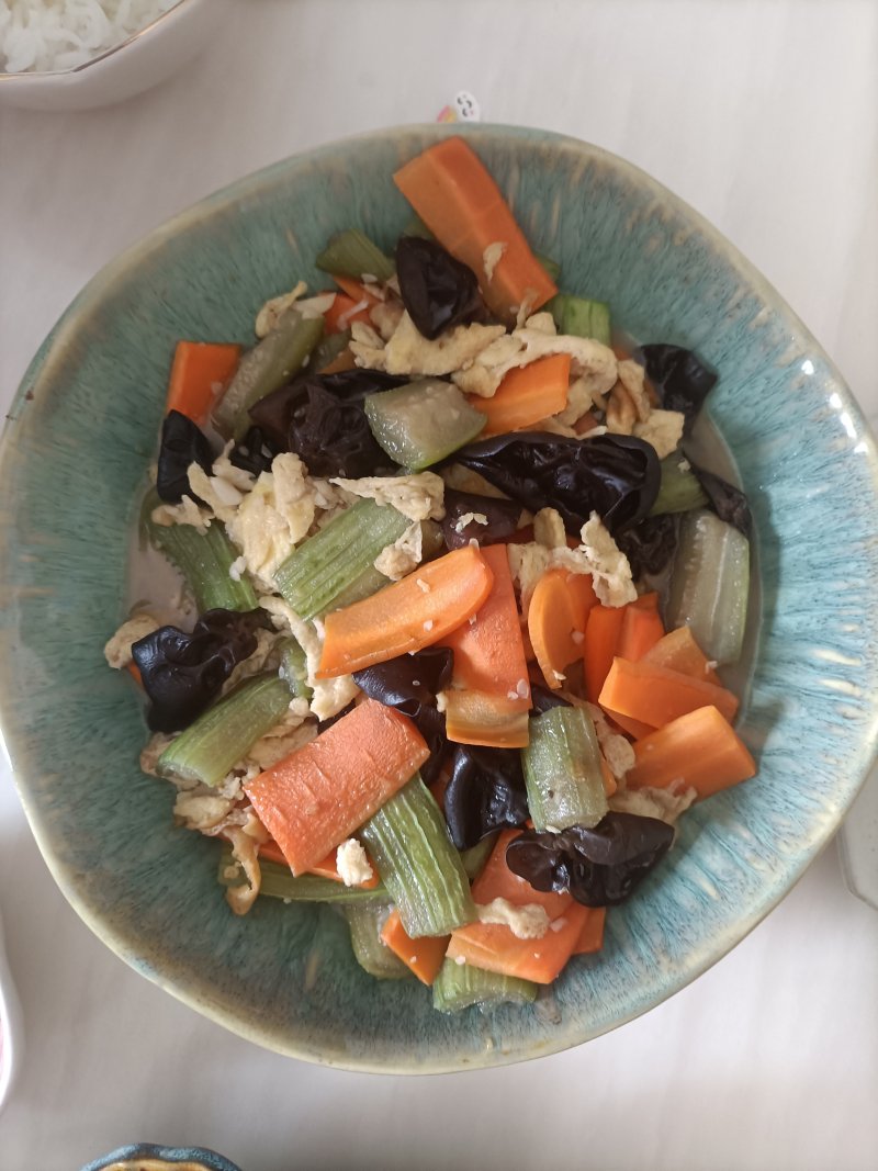 5:最后放入木耳,加放盐调味,再煸炒1-2分钟,通道木耳的爆声,即可关火。