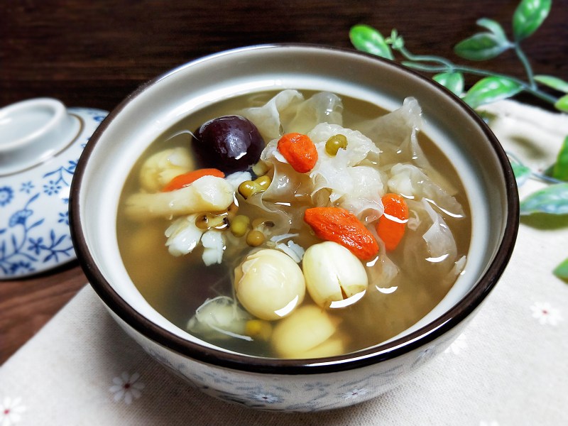 莲子20g;百合15g;绿豆20g;红枣30g;银耳半朵;沙参15g;枸杞子10g;