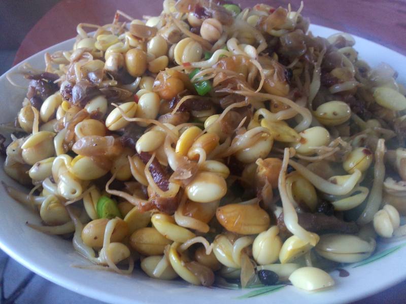4:下入肉丝炒作变色后加入酱油在吧黄豆芽放入炒一会放少许盐