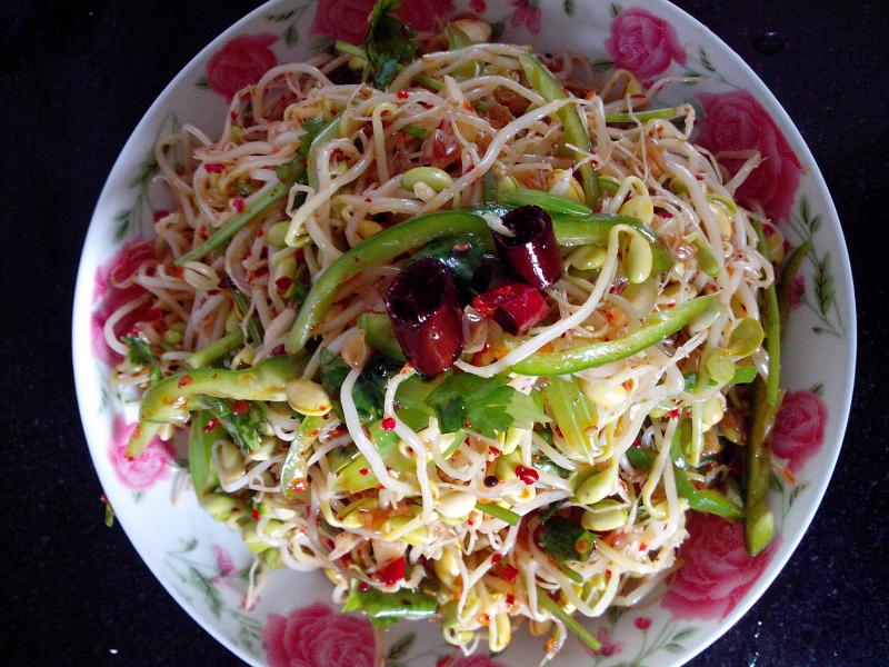 3:将之前切好的配料放入黄豆芽中,再将以上调料放入