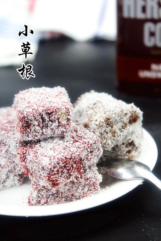 黑巧克力50克;动物淡奶油100克;红曲粉7克;白巧克力50克;椰蓉100克;