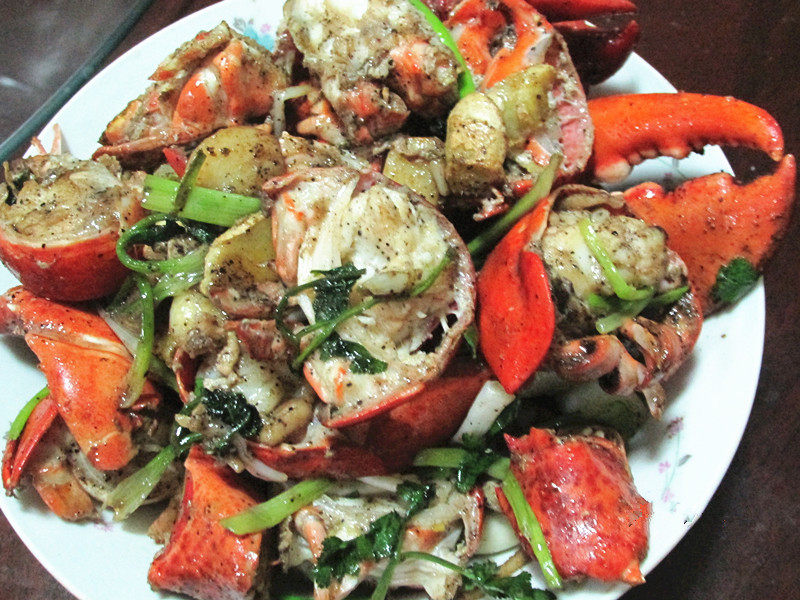 这道菜是在婆家做的,没找到白胡椒粉,只好用了黑胡椒粉,有点影响品相。白胡椒温胃,黑胡椒补脾肾,白胡椒味道比黑胡椒要柔和。我一般做汤和鱼时用白的,煎烤类的用黑的。澳洲龙虾挺贵的,虾头和虾爪子不要扔了,可以用来做粥。具体做法是:将洗净的虾头和虾爪先用少量油炒香,加姜片、葱段、水煮十分钟左右,捞出所有材料,加米煮至浓稠,加少许盐、白胡椒调味,最后撒香葱碎,美味香浓的虾粥就做好了。
