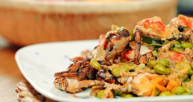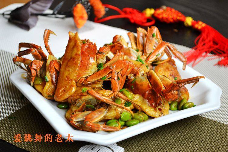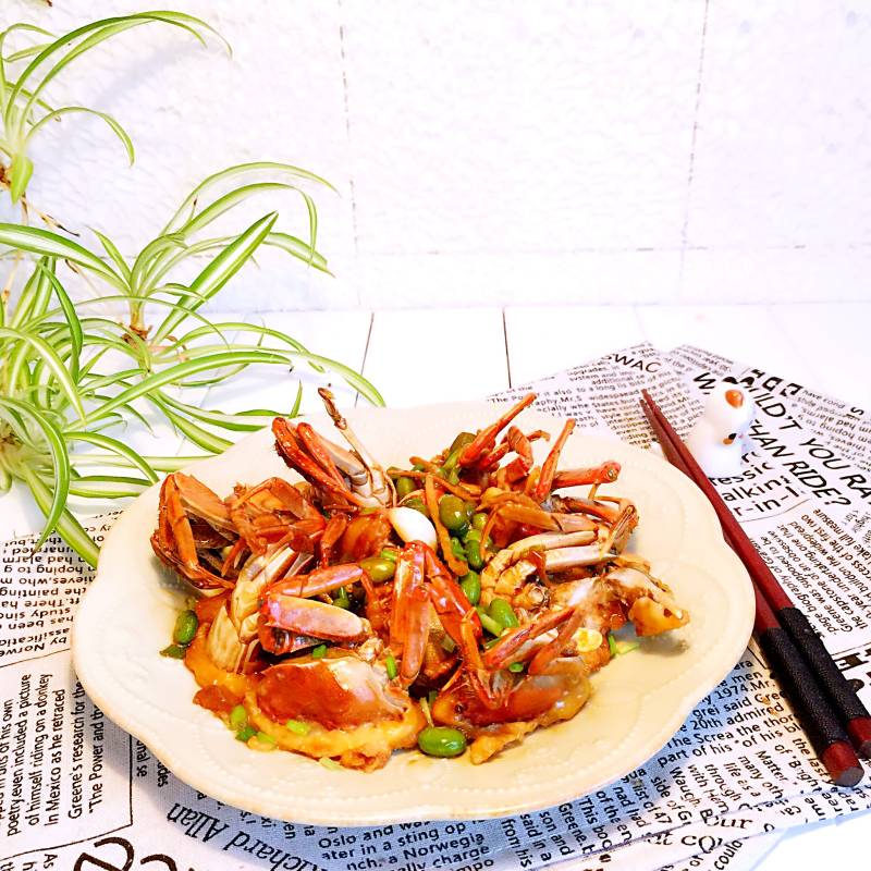 4:继续用煎螃蟹的油炒毛豆煸炒至毛豆变色变皱,加入螃蟹炒均匀,再放料酒,倒入适量的水,酱油,再放姜丝,大火煮3分钟。