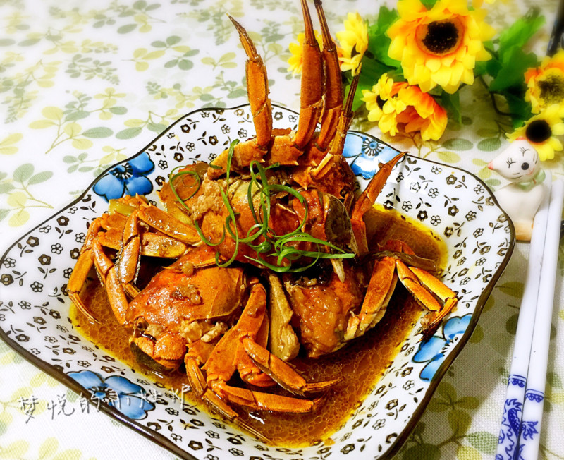螃蟹6个;葱2棵;姜片3块;普通面粉50克;玉米油(用不完)50克;甜面酱1勺;味极鲜0.5勺;料酒0.5勺;香醋1/3勺;盐3克;白砂糖5克;黑胡椒粉1/2匙;清水150ml;