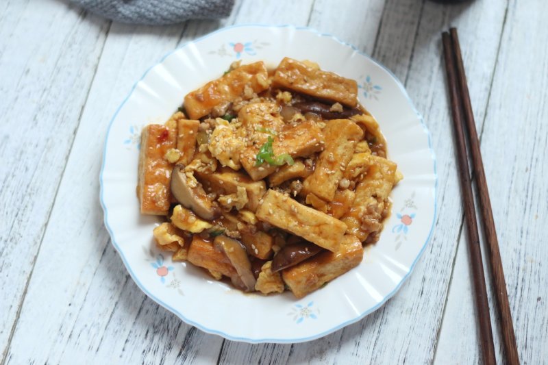 8:加入煎好的豆腐块和酱汁翻炒均匀。