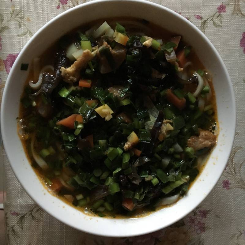 胡萝卜66克(半根);泡开的金针菜干12根;泡开的黑木耳6朵;豆腐皮33克(一张);五花肉180克;红菜椒71克(半只);土豆135克(半只);宽面条250克;