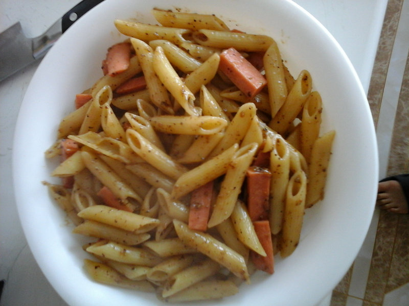 1:黑胡椒酱适量加水稀释(视个人口味而定),火腿肠切成与通心粉大小相仿的块。