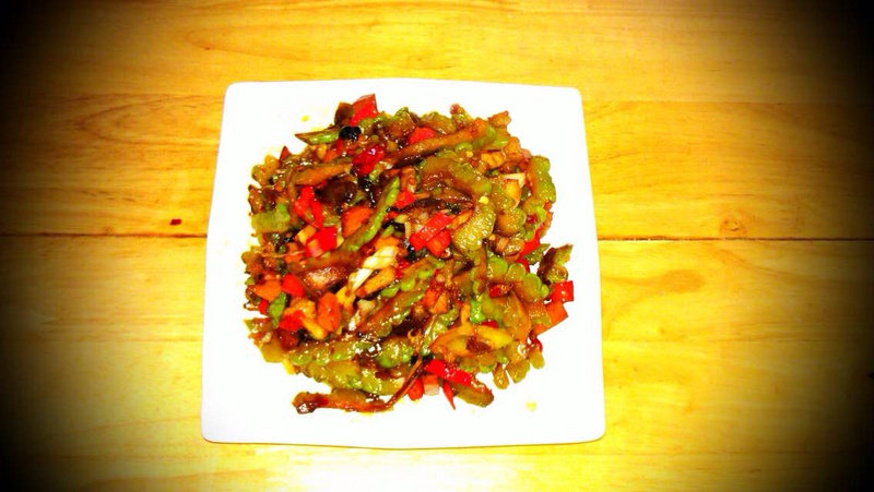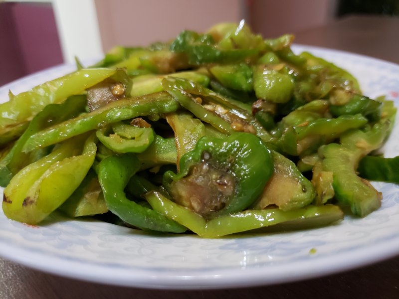 3:锅烧热放少许油,倒入尖椒炒香,再倒入苦瓜加少许盐和生抽调味,翻炒几下即可。