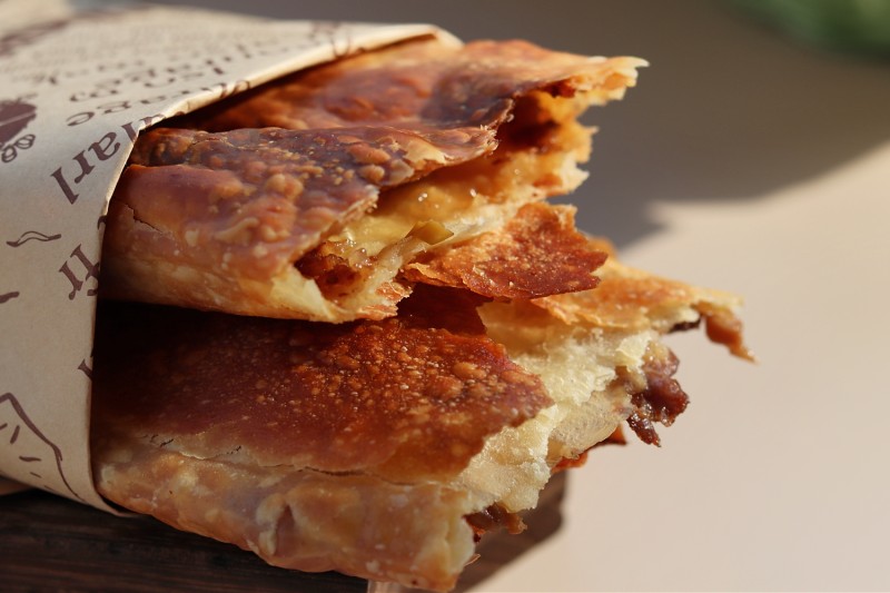 11:中火煎至两面金黄取出。不要小火慢煎会损失过多水分而使面饼发硬,后面还需要烤箱烤制。