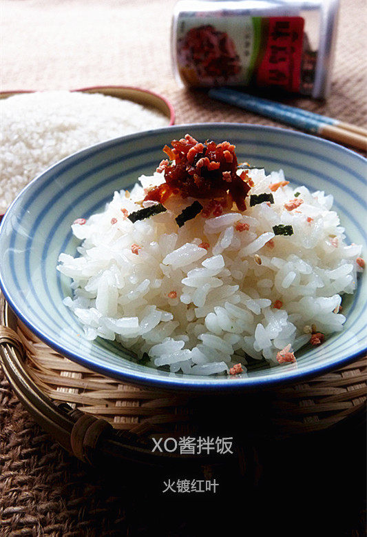 5:饭上碗后拌入XO酱,撒下小许的三文鱿松,即可食用