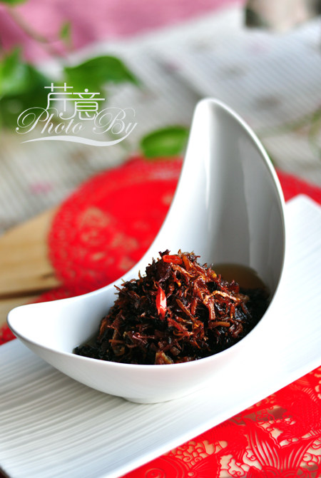 3:雪里红烫熟后拧干水。切丝待用。
