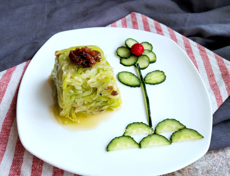 10:最后把拌好的莴笋丝摆入盘子里,上面再放一点XO酱。