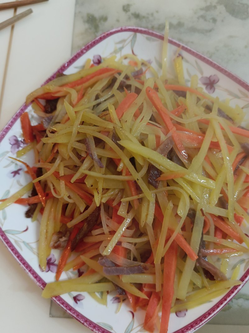 1:腊肉和胡萝卜切成丝,土豆切成丝后用盐水泡着,避免变色。