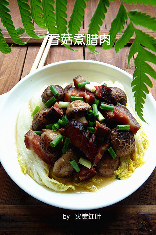 1:备材料,香菇预先泡透,烟熏腊肉切件