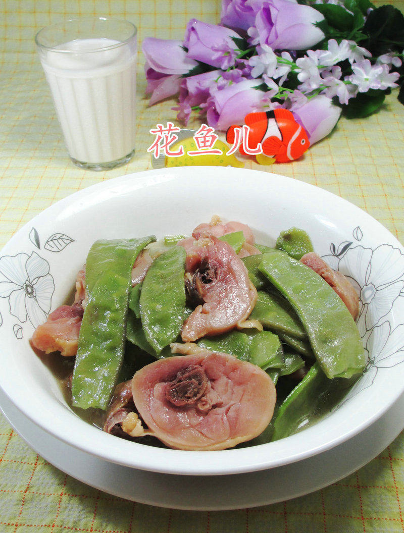 3:烧锅倒油烧热,下入剁好的腊鸡腿和已摘洗好的扁豆翻炒翻炒。