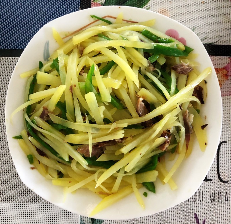 1:土豆切丝用水泡着,避免氧化变色。煮好的腊肉切丝,青椒丝切丝备用。