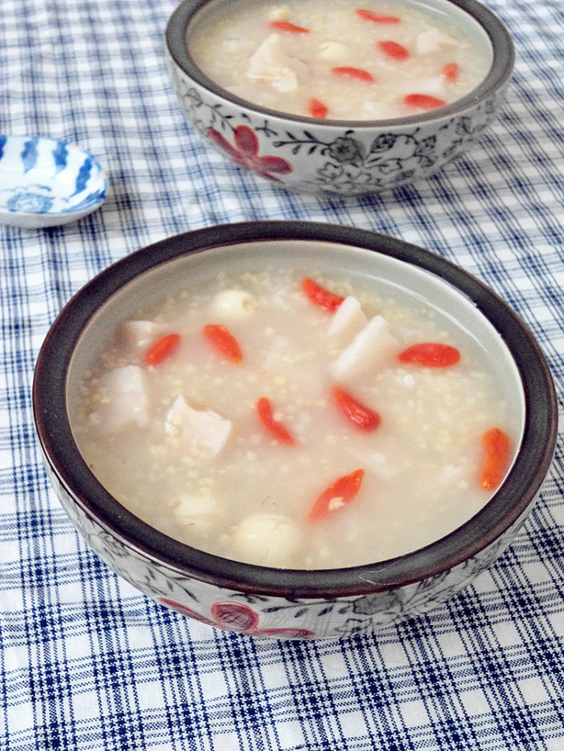 10:煲至双米开花,双莲软糯即可断电,撒入枸杞。