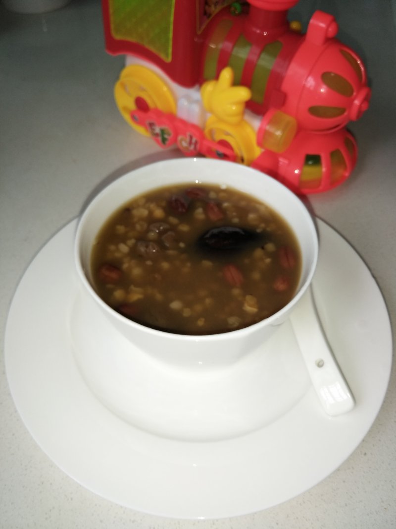 2:将玉米碎、花生、红枣(去核)洗一洗,加入水和桂圆和灰水,放入电饭煲,煲粥2小时,加入红糖即可