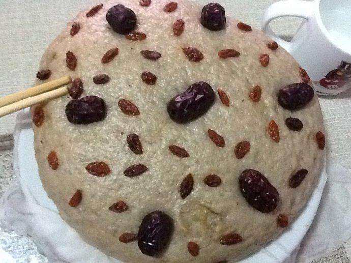 4:在发酵好的面糊表面撒上葡萄干(或红枣干等),开火上笼蒸,大火蒸制35分钟即可,就能蒸出饱满蓬松、味美香甜的杂粮面发糕。