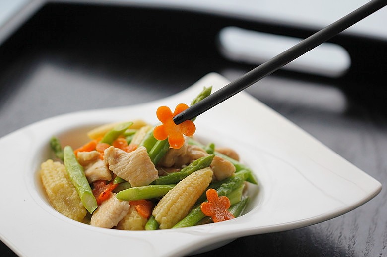 鸡脯肉100克;芦笋150克;玉米笋100克;