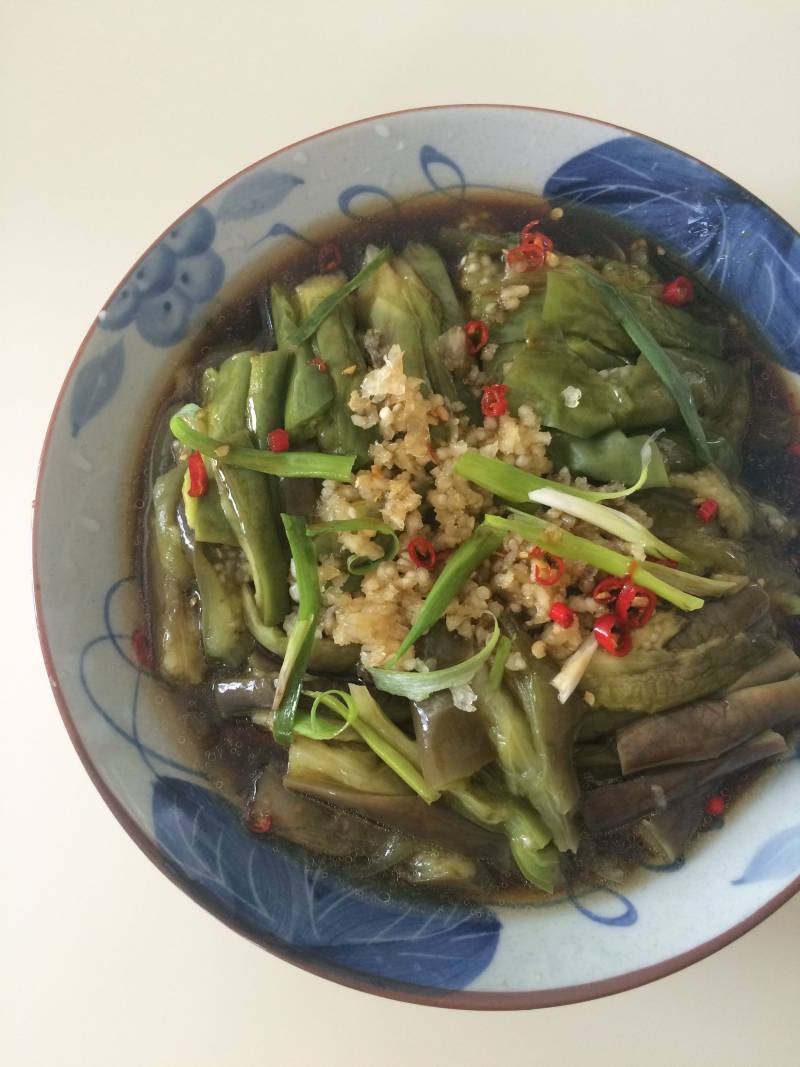 10:合好的调汁浇在蒸熟的茄子上拌匀即可。