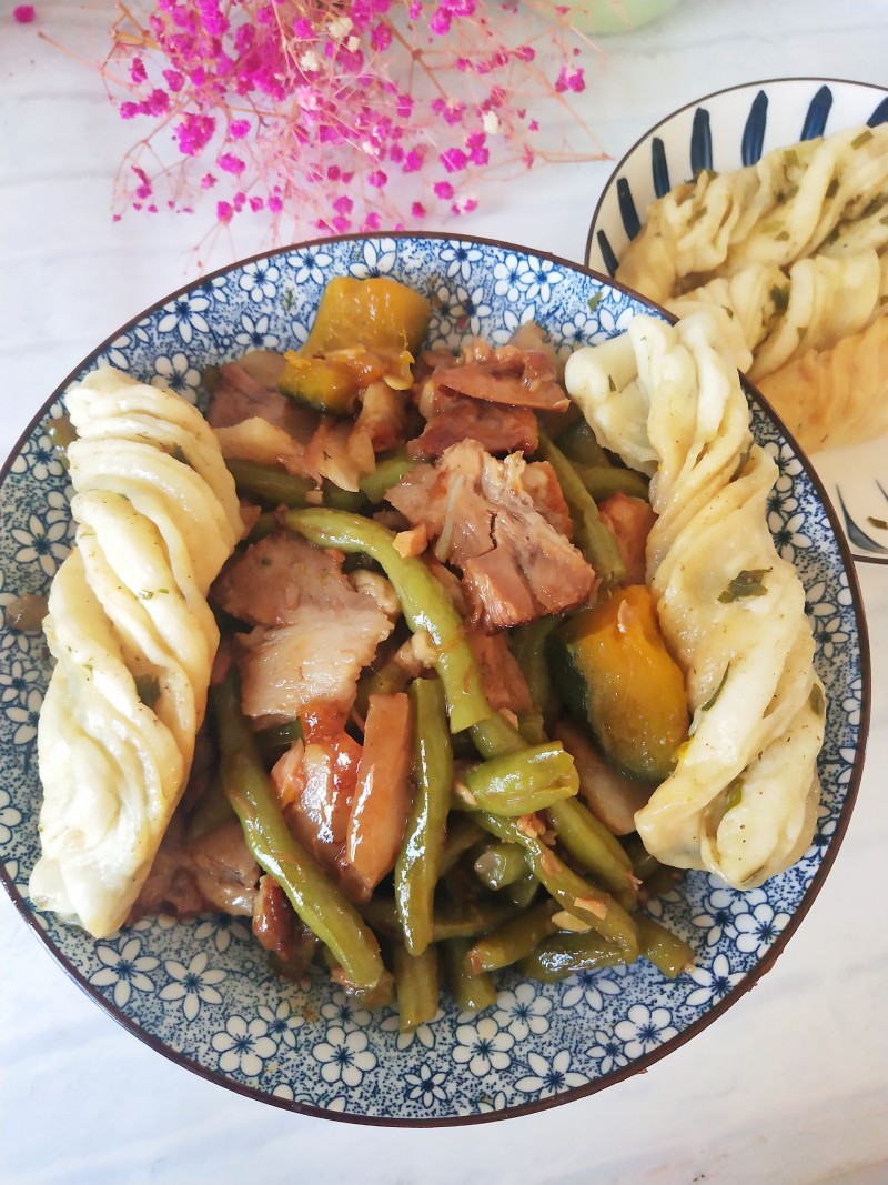 1:豆角洗净掰段,南瓜洗净,焖好的冻肉拿出解冻。