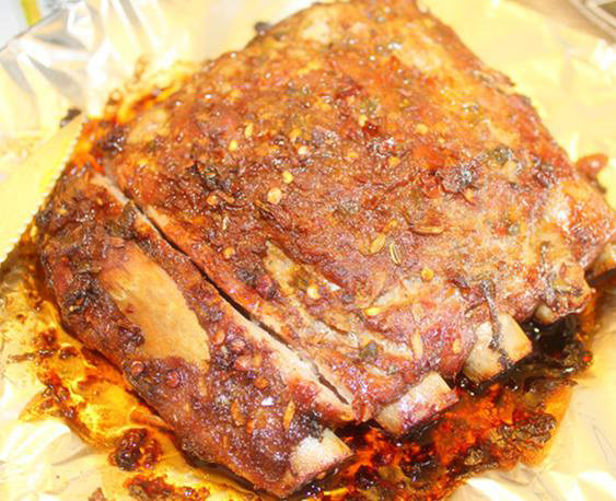 5:过1个把小时的时候,倒出汤汁(有的可能在调料中未放什么液体也就没什么汤汁),排骨翻面,继续放入烤箱,华氏400度再烤20分钟至半个小时即可。