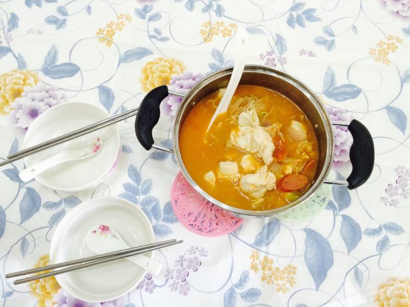 1.我们的口味偏甜,加点糖除了中和咸味还能提鲜。不喜欢的可以不加,调味总得根据自己的口味来调整。如果是新手,可以先按食谱做一次,然后在此基础上增减调味品。2.喜欢什么菜都可以往里加,但泡菜和豆腐应该是必备的,其实还有洋葱,我买菜的时候忘记了,就没加。3.我的砂锅很小,直径大约15CM,一个人吃够了。4.如果能吃辣,建议再加一勺辣椒粉。5.韩国人喜欢淘米水,可以增加汤的稠度,没有可以用清水。6.西兰花也可以单独煮熟,待装盘拍照的时候摆放在汤面上,颜色比较好看。