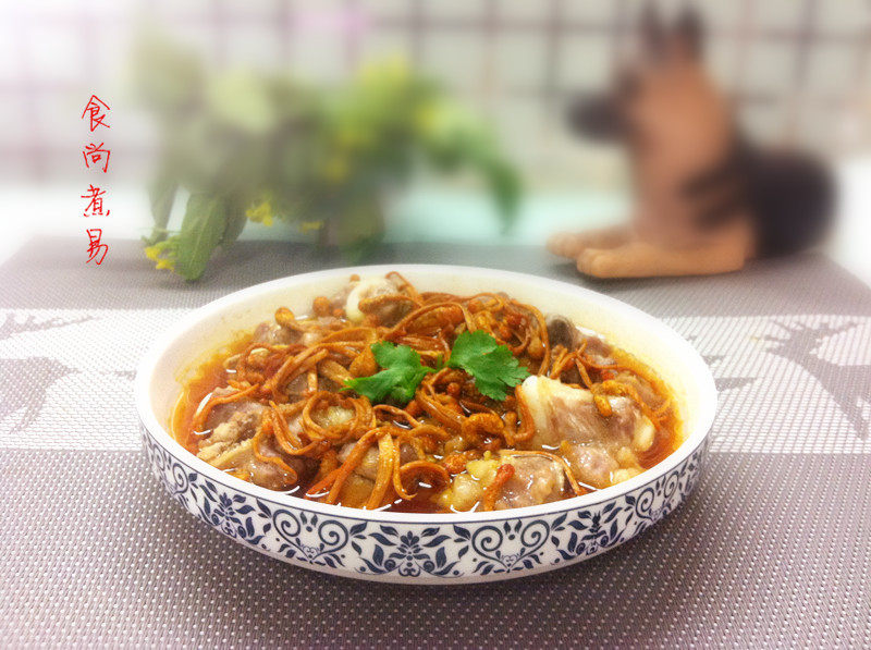 9:再把腌制好的排骨放在虫草花上,淋上配料和汤汁