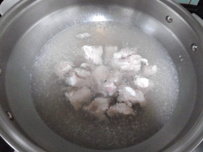 3:砂锅中加入适量清水大火烧开,水开后下入排骨汆烫后捞出(大火7分钟)