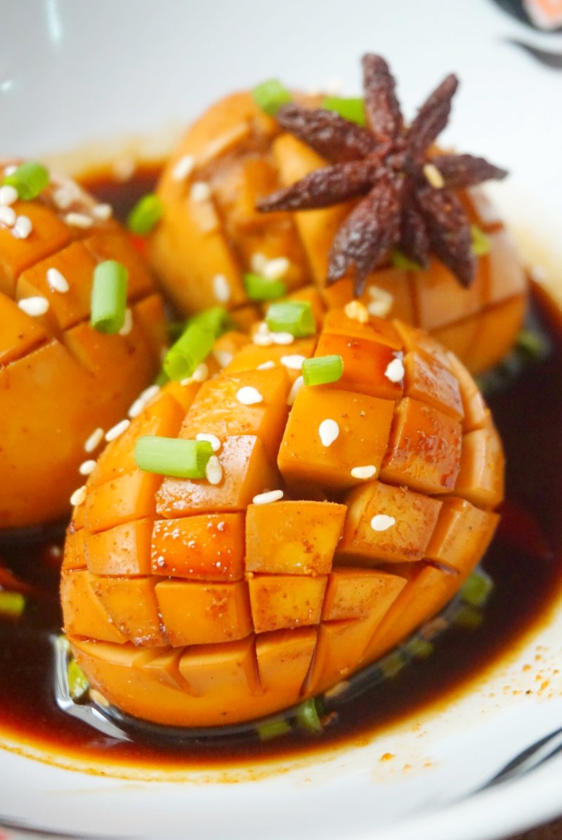 6:中间时不时翻一下鸡蛋,使得上色均匀,煮至水分变成一半,撒上葱花,出锅,开吃。