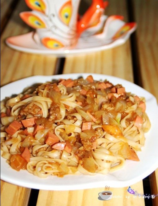 7:改小火,下入面条和火腿片翻拌均匀。放入适量盐。