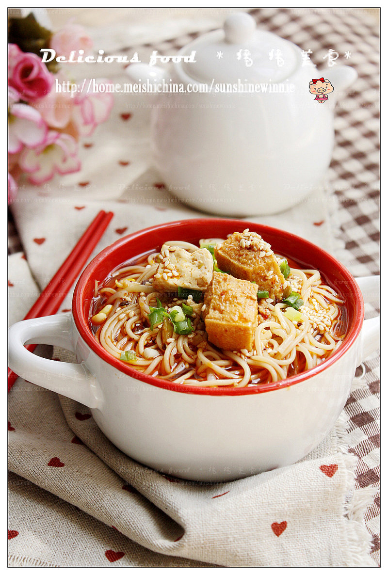 8:面条煮好后,只要面条,不需要加面汤,直接把做好的豆腐连汤一起加入面条里,根据自己的口味再加适量的鸡精芝麻油辣椒油和小葱香菜。