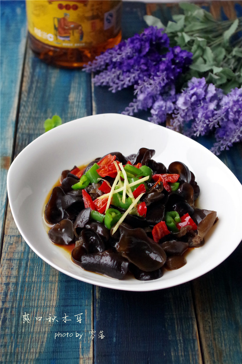 10:将第九步炒好的汁浇在木耳上,再调入适量花椒油,撒上姜丝即可。