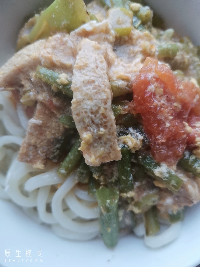 5:提前用培根肉搭配酸豆角打卤,配玉米面条真是太爽了。